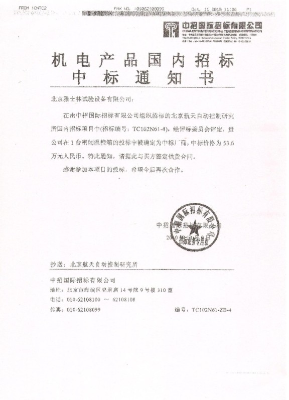 金秋十月,秋高氣爽!由中招國(guó)際招標(biāo)有限公司精心組織,在北京航天自動(dòng)控制研究所2010年國(guó)內(nèi)項(xiàng)目二期招標(biāo)中,北京雅士林試驗(yàn)設(shè)備有限公司憑借強(qiáng)大的綜合實(shí)力,以各項(xiàng)排名指標(biāo)均名列前茅的優(yōu)異成績(jī)成功中標(biāo)密閉溫控箱(招標(biāo)編號(hào):TC102N61-4)項(xiàng)目工程。中標(biāo)金額為53.6萬(wàn)元人民幣。 北京航天自動(dòng)控制研究所2010年密閉溫控箱工程項(xiàng)目是該所2010年的重點(diǎn)項(xiàng)目。該項(xiàng)目的成功中標(biāo)進(jìn)一步確立了北京雅士林環(huán)境試驗(yàn)設(shè)備在航天市場(chǎng)的領(lǐng)先地位,也為北京雅士林的的持續(xù)發(fā)展樹(shù)立了堅(jiān)實(shí)的信心。在環(huán)境試驗(yàn)設(shè)備市場(chǎng)競(jìng)爭(zhēng)空前激烈的情況下,北京雅士林以有效的資源投入、專注的研發(fā)、前瞻的設(shè)計(jì)理念、嚴(yán)謹(jǐn)科學(xué)的生產(chǎn)管理制度、及時(shí)高效專業(yè)的工程服務(wù)隊(duì)伍換來(lái)了在技術(shù)、產(chǎn)品、市場(chǎng)各方面的良好口碑,并取得了優(yōu)異的市場(chǎng)成績(jī)。