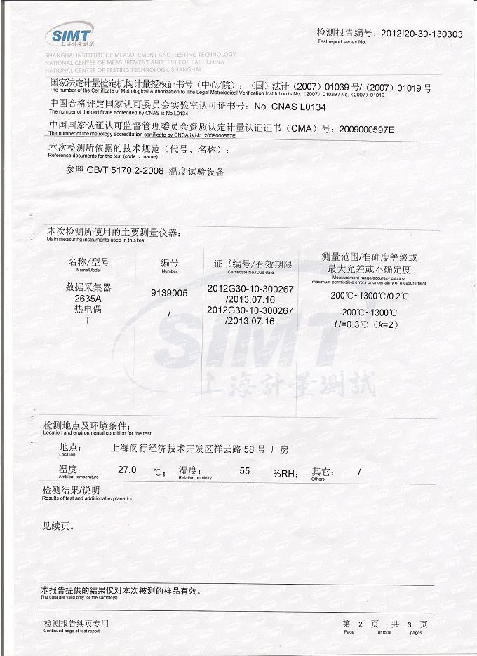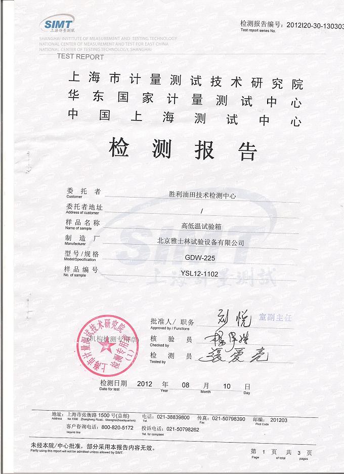 >>高低溫試驗箱檢測報告-上海計量院-勝利油田