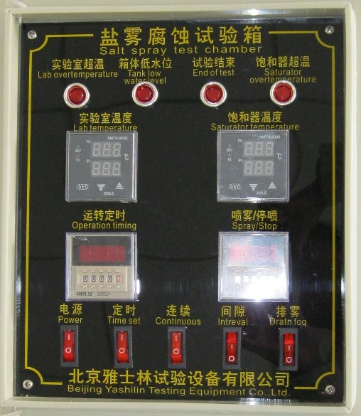 控制面板是鹽霧腐蝕試驗(yàn)箱的心臟,試驗(yàn)步驟都是通過(guò)控制面板上設(shè)定的,為了方便用戶對(duì)試驗(yàn)箱的操作,下面為您講述控制面板功能說(shuō)明: 實(shí)驗(yàn)室超溫:當(dāng)鹽霧試驗(yàn)箱工作室溫度超過(guò)試驗(yàn)設(shè)定值一定范圍時(shí),此報(bào)警燈亮。 箱體低水位:鹽霧腐蝕試驗(yàn)箱在試驗(yàn)過(guò)程中缺水時(shí),此報(bào)警燈亮。 試驗(yàn)結(jié)束:當(dāng)試驗(yàn)運(yùn)轉(zhuǎn)時(shí)間到達(dá)設(shè)定值時(shí),此燈亮(設(shè)備停止工作)。 飽和器超溫:當(dāng)飽和器溫度超出空氣開(kāi)關(guān)設(shè)定值一定范圍時(shí),此報(bào)警燈亮。 實(shí)驗(yàn)室溫度:顯示試驗(yàn)過(guò)程中實(shí)驗(yàn)室的實(shí)際溫度和設(shè)定溫度。 飽和器溫度:顯示試驗(yàn)過(guò)程中飽和器的實(shí)際溫度與設(shè)定溫度。 運(yùn)轉(zhuǎn)定時(shí):對(duì)試驗(yàn)時(shí)間進(jìn)行實(shí)時(shí)設(shè)定,試驗(yàn)時(shí)間到達(dá)設(shè)定值,設(shè)備停止運(yùn)轉(zhuǎn)。 噴霧/停噴:此定時(shí)器是噴霧時(shí)間設(shè)定、停噴時(shí)間設(shè)定、時(shí)間單位選擇。 排霧:試驗(yàn)結(jié)束時(shí),按下此按鈕,將試驗(yàn)箱內(nèi)的鹽霧氣體趕出,通過(guò)排霧口排出。 間隙:按下此按鈕,噴霧塔將按計(jì)時(shí)器設(shè)定的時(shí)間進(jìn)行間隙性噴霧。 連續(xù):按下些按鈕,噴霧塔進(jìn)行連續(xù)噴霧。 定時(shí):按下此按鈕才可以對(duì)設(shè)備進(jìn)行試驗(yàn)運(yùn)轉(zhuǎn)總時(shí)間定時(shí)。 電源:設(shè)備通電工作。