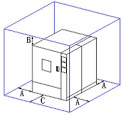9、高低溫試驗(yàn)箱周圍應(yīng)留有適當(dāng)?shù)氖褂眉熬S護(hù)空間,如下圖所示:注:A:不小于60cm  B:不小于60cm C: 不小于70cm