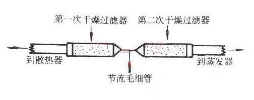 恒溫恒濕試驗(yàn)箱制冷系統(tǒng)在檢修時(shí),由于操作工藝不嚴(yán),往往會(huì)造成制冷系統(tǒng)中的水分不能處理干凈或系統(tǒng)中的空氣排不干凈。這些水分在恒溫恒濕試驗(yàn)箱制冷系統(tǒng)中會(huì)與制冷劑、油反應(yīng)生成氫氟酸和鹽酸,腐蝕各部件、管道和冷凍油,尤其對(duì)鋁制平板式蒸發(fā)器腐蝕更嚴(yán)重。為了徹底解決這一問題,完全清除制冷系統(tǒng)中殘余水分,下面為大家介紹兩次過濾法,具體做法見下圖,在蒸發(fā)器與毛細(xì)管之間增加一個(gè)帶有干燥劑的過濾器。