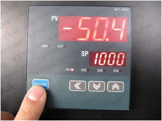 3、打開(kāi)控制器按“SET/ENT”按鍵,SV顯示值光標(biāo)閃爍,再點(diǎn)擊“上下標(biāo)志圖”,設(shè)定所需溫度,再按“SET/ENT”進(jìn)行確認(rèn)。