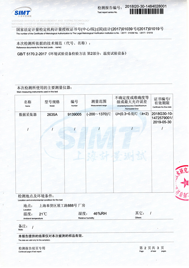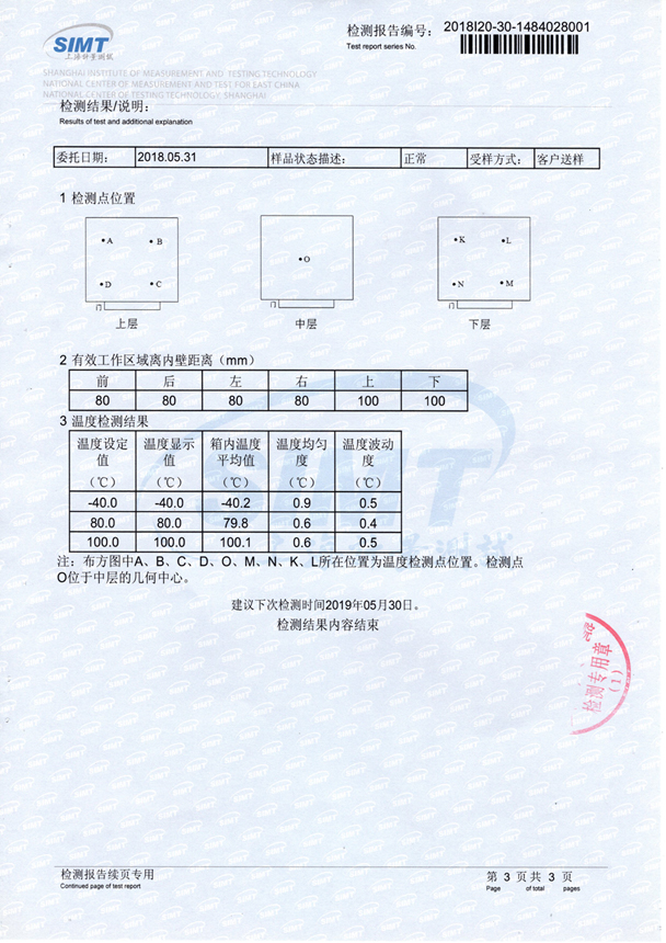 高低溫試驗(yàn)箱在首次投入使用前,應(yīng)對(duì)可反映設(shè)備性能的相關(guān)參數(shù)進(jìn)行詳細(xì)確認(rèn)及測(cè)試,在日常使用中則應(yīng)依據(jù)所使用的試驗(yàn)方法進(jìn)行對(duì)試驗(yàn)參數(shù)的要求,需確認(rèn)其性能是否滿足試驗(yàn)參數(shù)的要求。更多的用戶會(huì)選擇由第三方檢測(cè)機(jī)構(gòu)進(jìn)行檢測(cè),并出廠檢測(cè)報(bào)告,如下: